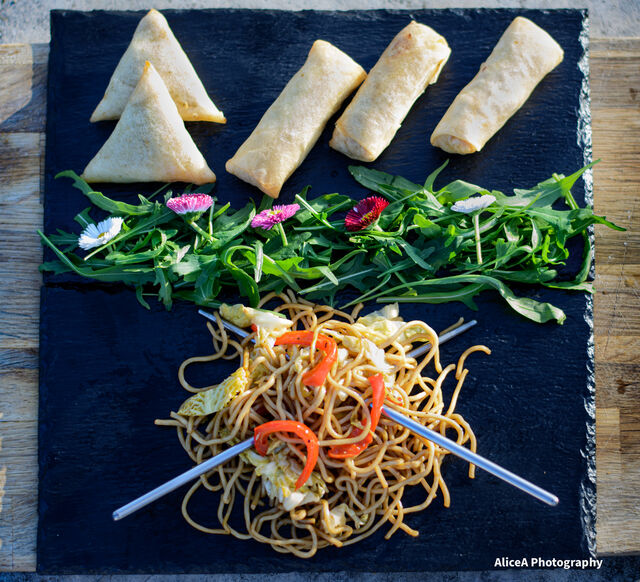 Je propose une cuisine mixte avec des spécialités tels que nems, samoussas accompagnés de nouilles sautées ou de riz cantonais, mais aussi des plateaux de sushis!